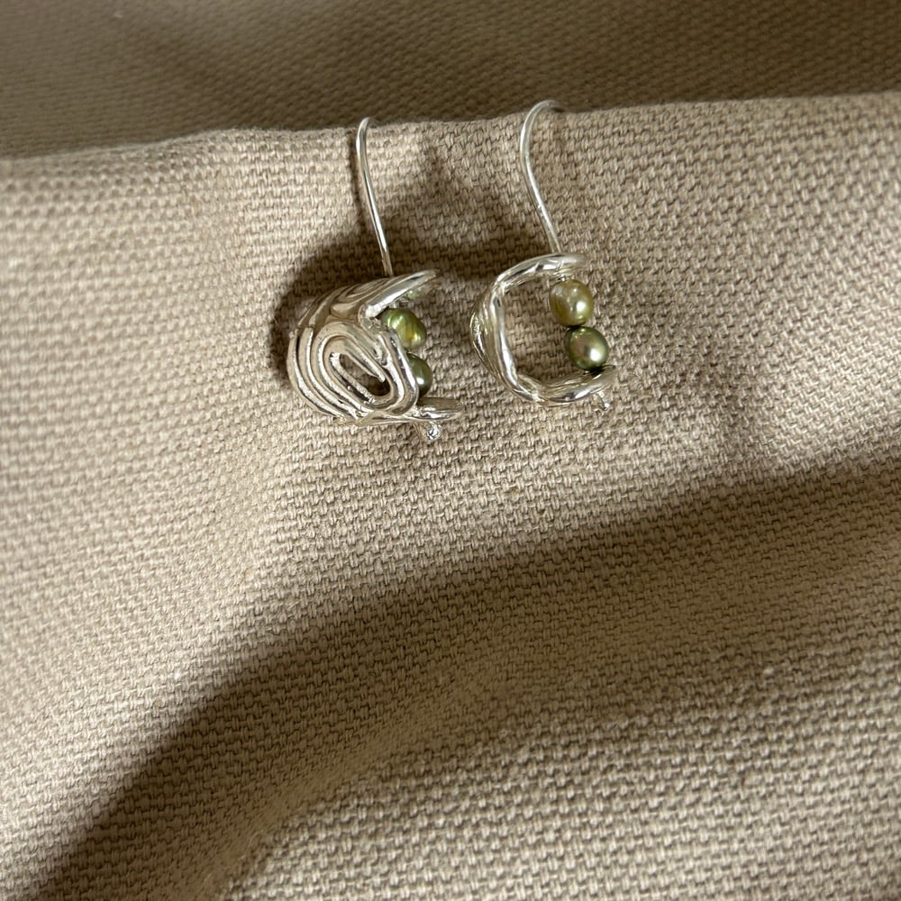 Our little drop earring have accent freshwater pearls hiding inside each one. The pearl is moveable threaded on a silver earring post.